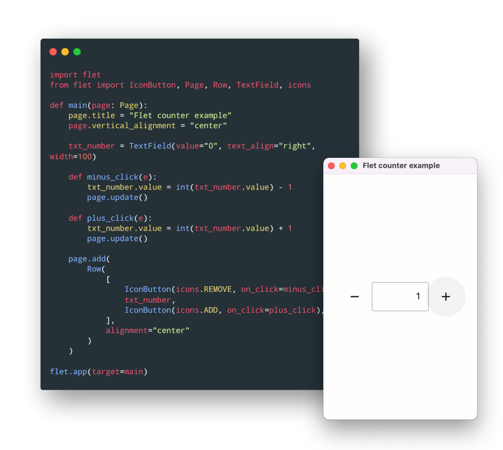 Flet UI is built with Flutter, so your app looks professional and can be delivered to any platform. Flet simplifies Flutter model by combining smaller "widgets" into ready-to-use "controls" with imperative programming model.