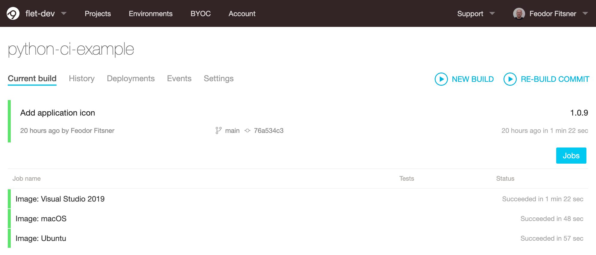 • Runs flet pack to package Python app into a bundle for Windows, macOS and Ubuntu.